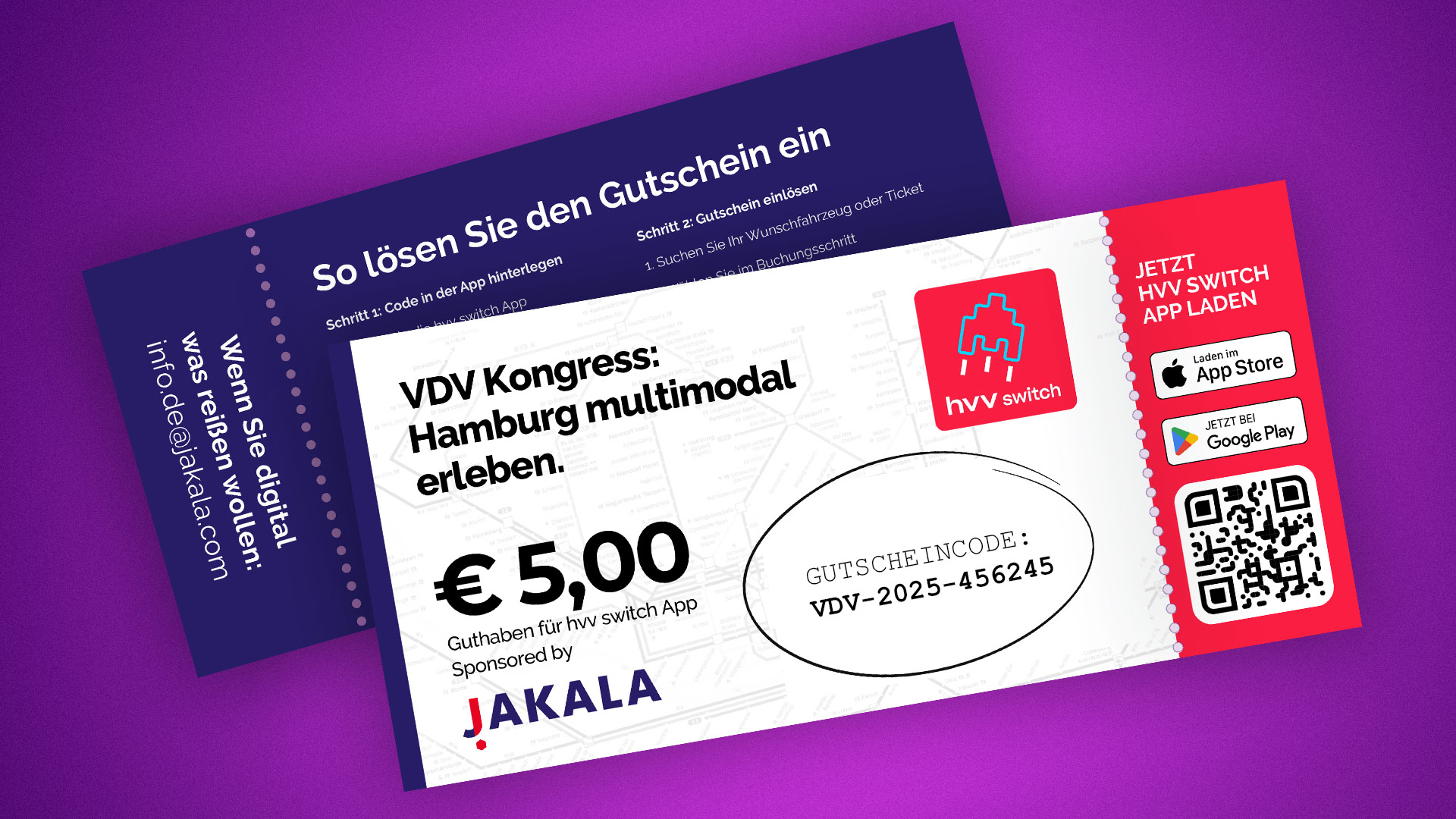Anstatt nur eine Liste mit 250 Rabattcodes zu verschicken, habe ich für den VDV Kongress ein haptisches Give-away konzipiert. Als Softwaredienstleister für die hvv switch App wollten wir den Besuchern Mobilität direkt zum Ausprobieren mitgeben. Ich habe das gesamte Konzept übernommen: Vom Ticket-Design über das Wording und die Nutzerführung („Wie löse ich den Code ein?“) bis hin zur finalen Druckabwicklung. Ein kleiner Eyecatcher, der zeigt, dass Software auch anfassbar sein kann.